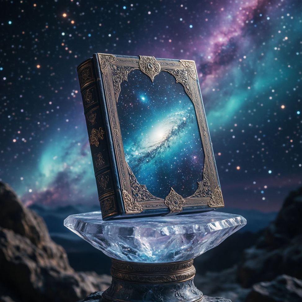 Портал поглотил их беззвучно — лишь на миг пространство дрогнуло, словно поверхность воды после брошенного камня. Когда зрение прояснилось, Лиза и Максим оказались в пространстве, где не было ни верха, ни низа— лишь бесконечное переливающееся пространство, где звёзды и туманности служили декорациями. В центре висел кристаллический пьедестал, на котором покоился древний фолиант с металлическими застёжками, мерцавшими как северное сияние.