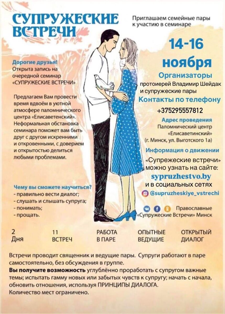 Семинар «Супружеские встречи» пройдет с 14 по 16 ноября 2025 года в Минске на базе Паломнического центра «Елисаветинский» Свято-Елисаветинского монастыря города Минска. Встречу проведут настоятель храма святителя Николая в городе Логойске протоиерей Владимир Шейдак с супругой Инной. Как супружеская пара, отец Владимир и матушка Инна принимают участие в работе Православного епархиального центра «Супружеские встречи» в Санкт-Петербурге, основанного протоиереем Александром Дягилевым. Полученный опыт и желание помочь другим подвигли их на проведение аналогичной работы в Минске.