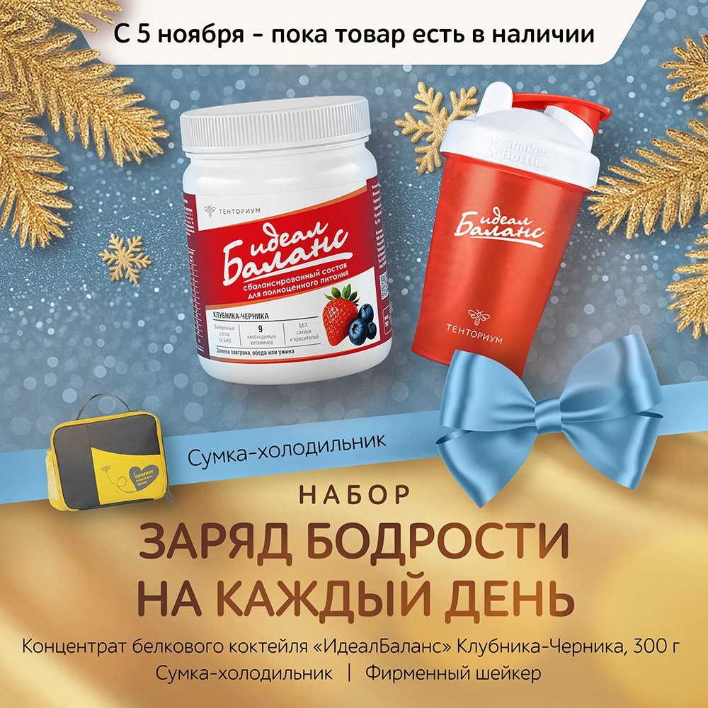 🔹Заряд бодрости на каждый день (белковый коктейль "ИдеалБаланс" Клубника-Черника 300 г, фирменный шейкер, сумка-холодильник) с выгодой 10%.