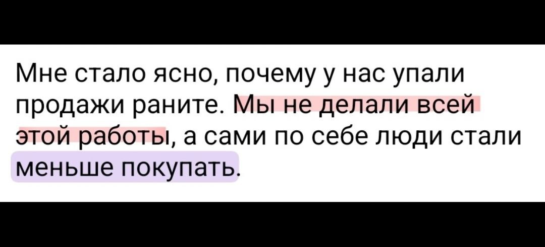 Самая большая ошибка в продажах - это искренне верить, что вы ими занимаетесь Присядьте, нам надо серьёзно поговорить. В августе этого года мы начали сотрудничество с очень интересной онлайн-школой. Проблема, с которой они пришли, стандартная для многих в этом году - упали продажи, не знаем, что делать. Погружаемся - и видим, что команда действительно занята по уши. Контент, рассылки, дизайн, мероприятия, таблички, куча планёрок... Но только одного там не было. Продаж. То есть формально - работа кипит. По факту - это был ритуальный танец вокруг продаж, но не сами продажи. Мы, конечно, засучили рукава и начали выстраивать все процессы заново. Кейс я обязательно покажу позже, потому что на первом же запуске мы подняли цены в 2 раза(!) - и это был крайне любопытный эксперимент для кризисного времени - и выполнили план, который казался нереальным 😉 Но сейчас речь не о кейсе. В этом примере скрыта главная ловушка рынка последних лет. Правда в том, что пока рынок растёт, пока люди