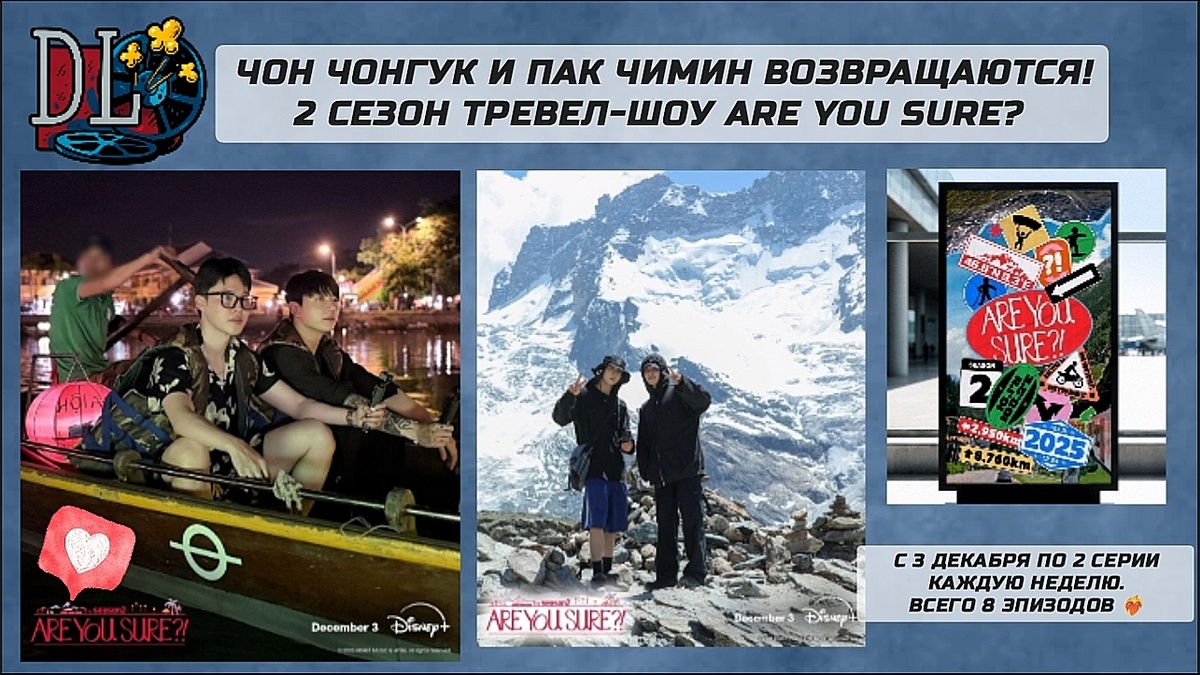 2 сезон тревел-шоу Are You Sure? на Disney Plus с 3 декабря 2025 ❤️🔥 Во второй части шоу Ты уверен? нам покажут 12-дневное путешествии Чимина и Чонгука в Швейцарию и вьетнамский Дананг. Они правда там были так долго? Вот время тогда быстро пролетело! Часть историй мы уже знаем, сливы в сеть были. Однако мы с вами их обсудим после выхода шоу! Нас ждет 8 эпизодов, по 2 серии каждую среду 🗓️ Готовьтесь улыбаться, много смеяться и таять от милоты 😉 Ведь съёмки были сразу после демобилизации, когда Гуки и Чими были ещё с щеками 💜 Бантаны скрасят нам холодный декабрь. Я уже давно жду, наконец мы это увидим ❤️🔥❤️🔥и не только, думаю стримы и лайвы мемберов будут сопровождать выходы серий 😉 #чончонгук #пакчимин #бтс #тыуверен #bts #jk #jimin #areyousure