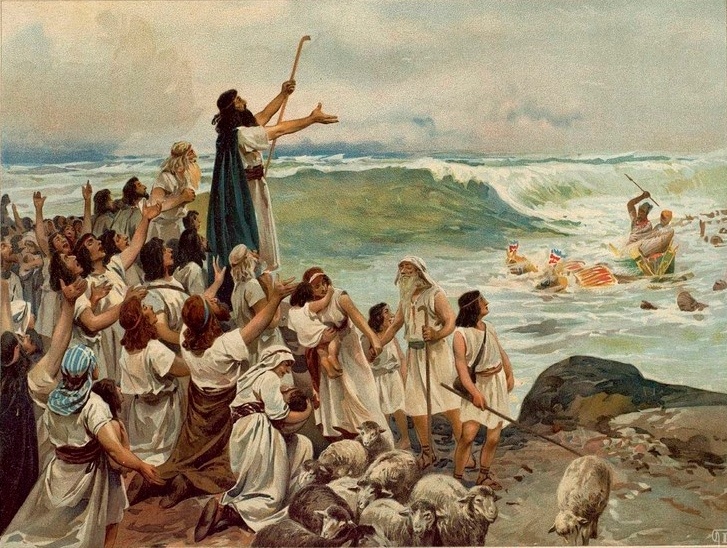 Один из ярких эпизодов книги Исход повествует о том, как Моисей мановением жезла приказал расступиться водам Красного моря. И тогда иудеи смогли перейти через море, как по суше, на другой берег. Затем воды вновь сомкнулись, потопив фараона с его войском, преследовавшим избранный народ.
