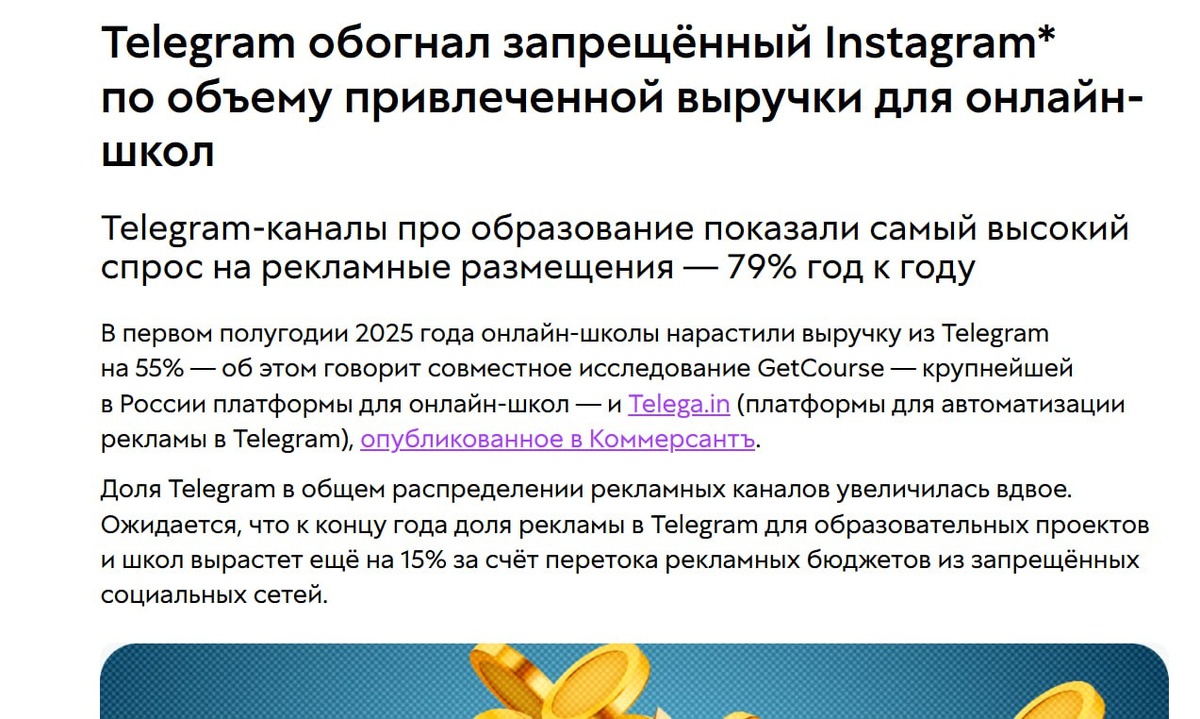 Telegram превратился в полноценную площадку для онлайн-образования Уже прошло время, когда мессенджер считался лишь вспомогательным каналом. Сегодня образовательные проекты зарабатывают здесь миллиарды рублей, демонстрируя рост на 79% за год. Почему все идут сюда: • Люди уже привыкли — учатся и покупают, не выходя из мессенджера • Не нужно каждый месяц переучиваться под новые правила • Всё под рукой: и чаты, и рассылки, и даже мини-приложения • Можно спокойно развиваться — конкуренты ещё не всё заняли Да, кто-то всё ещё боится, но обороты в миллиарды рублей говорят об устойчивости направления. Аудитория адаптировалась к техническим особенностям, бизнес - выстроил рабочие модели. Кто переехал в Telegram год назад — сейчас уже на шаг впереди. Остальные просто откладывают свой старт, глядя на чужие результаты.