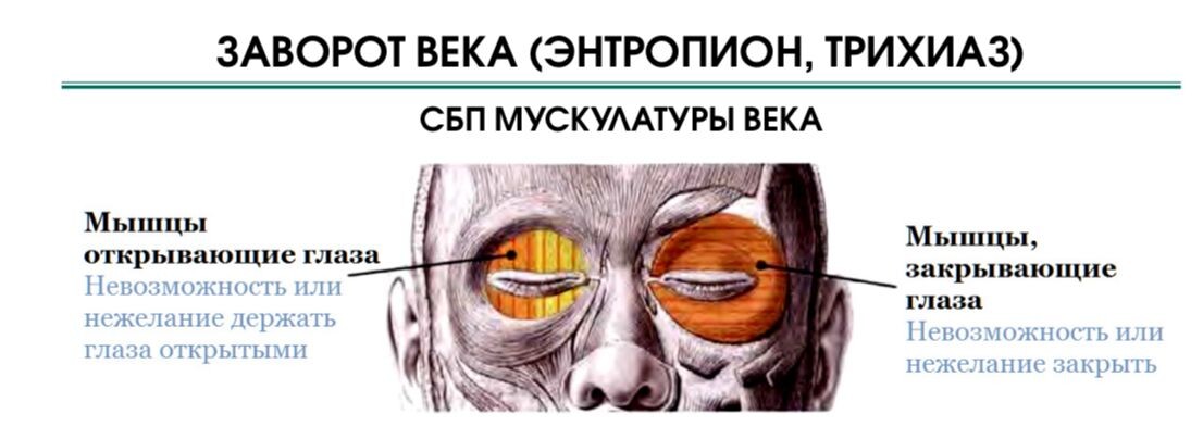 Задачей мышцы, закрывающей глаз (M. orbicularis), является закрывание века. Из-за повышенного напряжения этой мышцы ресницы заворачиваются внутрь и болезненно трутся о конъюнктиву. (= энтропион). Заворот века — это такое заболевание, при котором волосистая часть и слизисто–кожное соединение повернуты к глазному яблоку. В медицине заворот нижнего века является более распространенным, чем заворот верхнего. В основном болезнь поражает людей пожилого возраста. Врожденная форма заболевания встречается редко и идет вместе с другими генетическими номалиями. Энтропион чаще всего вызывает повреждение роговицы и конъюнктивы. В запущенных случаях может развиться язва роговицы и перфорации. При моргании, любом прикосновении обостряются болезненные ощущения. Симптомы данного заболевания проявляются, когда наружное веко трется о поверхность глаза. Среди симптомов выделяются: боль, синдром сухого глаза, раздражение, ухудшение зрительного восприятия. Возможно выделение из глаз слизи. У большинства