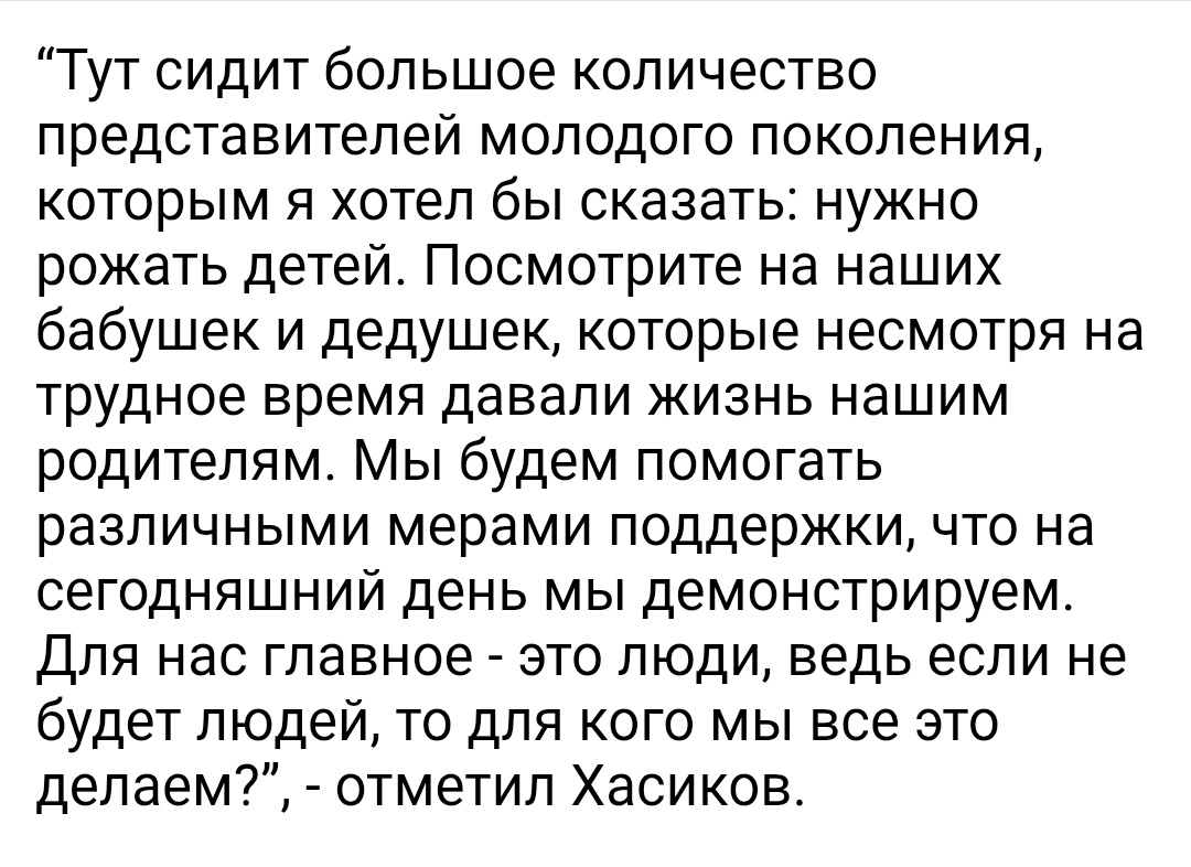 В ответ на пост "Нас должно быть больше". Это фраза Главы Республики Калмыкия Бату Хасикова прозвучала в последний день 2024 года как определение приоритета, как вектор работы руководства Калмыкии над проблемой демографии. Сегодня тезис Хасикова получил иделогическое осмысление и побудительное (рекомендательное, скажем так, учитывая источник этих смысловых ориентиров) значение для чиновников в первую очередь, для всего общества в статье начальника управления Президента по вопросам мониторинга и анализа социальных процессов Александра Харичева. Статья опубликована в № 2 журнала «Государство» (выпускается РАНХиГС и проектом «ДНК России»). "Нас должно быть больше. Вопросы демографии должны стать для каждого из нас первостепенными, чтобы количество многодетных семей продолжало расти, - сказал Б.С. Хасиков 31 декабря 2024 года. Ранее руководитель Калмыкии со свойственной ему прямотой призывал молодые семьи рожать детей по примеру старшего поколения: "Посмотрите на наших бабушек и дедушек