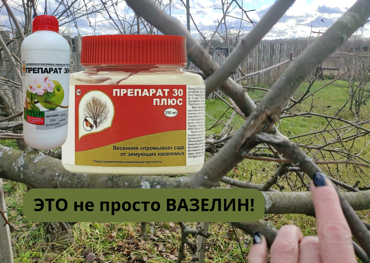 - Сначала минеральное масло (Препарат 30+) — «снимаем» зимующие стадии вредителей.