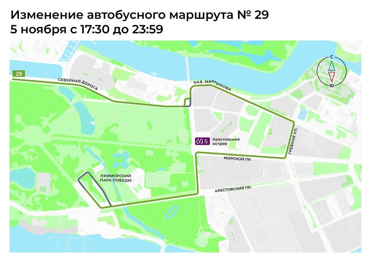 В связи с проведением футбольного матча на стадионе «Газпром Арена» 5 ноября с 17:30 до 23:59 будет временно изменена схема движения автобусного маршрута №29 «Автобусная станция «Крестовский остров» – набережная Гребного канала». Новая схема теперь будет такой: от начального пункта до Рюхиной улицы, далее по Рюхиной улице, Морскому проспекту, Гребной улице, набережной Мартынова, Рюхиной улице, Северной дороге с последующим возвратом на основную трассу. В обратном направлении автобус будет следовать от конечного пункта до Северной дороги, далее по Северной дороге, Рюхиной улице, набережной Мартынова, Гребной улице, Морскому проспекту, Рюхиной улице с возвратом на основную трассу. Горожанам и гостям города рекомендуется учитывать изменения при планировании поездок. После завершения матча и окончания временного ограничения в 23:59 движение автобусов маршрута №29 будет восстановлено в обычном режиме. Ранее «Петербургский дневник» писал о том, что в Петербурге временно изменили маршруты авт