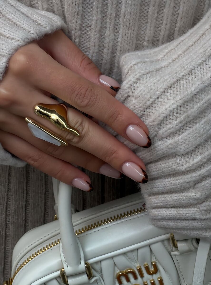 Ноябрь - это месяц перехода от яркой осени к холодной зиме. Мир вокруг меняется, а это значит, что пора обновить маникюр. Стильный дизайн ногтей станет завершающим штрихом в создании гармоничного осеннего образа. Предлагаем вашему вниманию несколько идей для вдохновения. Молочная база в этом маникюре придает ногтям ухоженный вид и визуально удлиняет их. Этот чистый и нейтральный фон идеально подходит для игривого и эффектного леопардового принта на кончиках. Этот экзотический узор добавляет образу нотку эксцентричности и привлекает внимание к ногтям. Однако благодаря сочетанию с нежной молочной базой он не выглядит вызывающе. В этом маникюре используется великолепная палитра главных оттенков осени - темно-коричневого, оранжевого, желтого, бордового. Для каждого ногтя выбран свой цвет. Объединяет их изящная полоса из золотистых блесток, которая проходит поперек все ногтевых пластин, добавляя образу роскошного сияния. Это очередная версия классического французского маникюра, никогда н