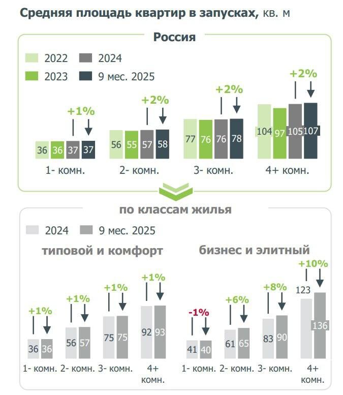 По данным ДОМ.РФ, в новых проектах 2025 года квартиры стали больше: