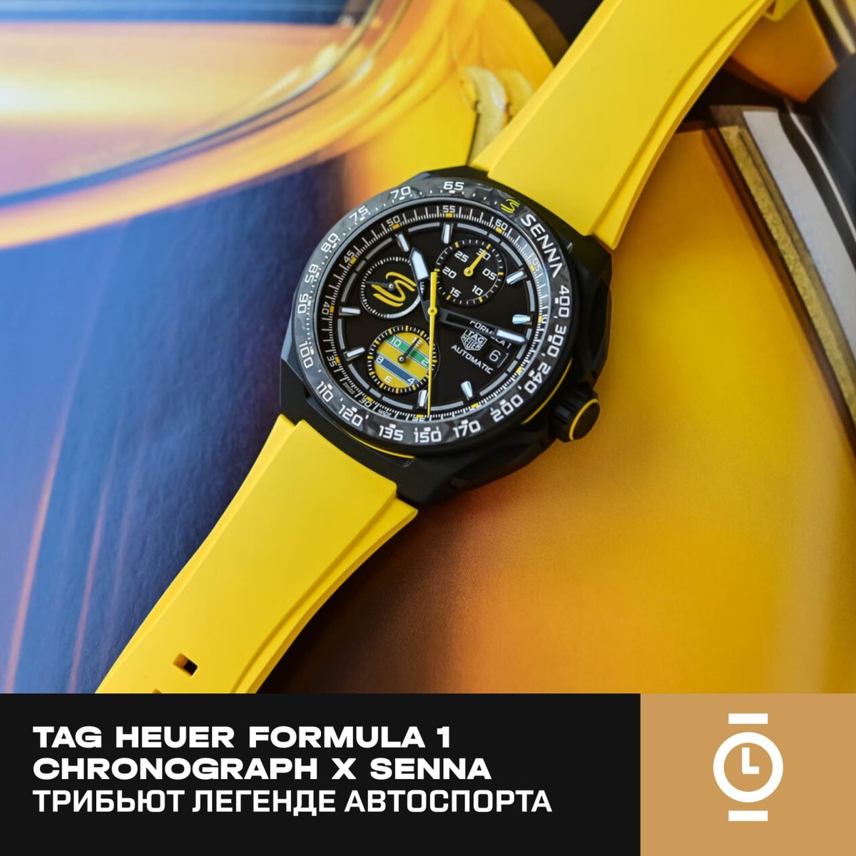 TAG HEUER FORMULA 1 CHRONOGRAPH X SENNA — ТРИБЬЮТ ЛЕГЕНДЕ АВТОСПОРТА #новости_WD TAG Heuer представила Formula 1 Chronograph x Senna — механические часы, посвящённые Айртону Сенне. Модель основана на обновлённой платформе коллекции Formula 1, отличающейся улучшенными пропорциями, титановыми корпусами и интегрированными ремешками. Корпус из пескоструйного титана Grade 2 диаметром 44 мм покрыт чёрным DLC и выдерживает давление до 200 м. Безель из кованого карбона с тахиметрической шкалой и жёлтым кольцом украшен фирменной буквой «S» Сенны. На задней крышке выгравированы глаза гонщика за визором шлема. Чёрный циферблат с радиальным сатинированием оформлен в гоночных цветах Сенны — жёлтом, синем и зелёном. Три счётчика хронографа и стрелки с Super-LumiNova обеспечивают хорошую читаемость. За работу отвечает автоматический калибр TAG Heuer 16 (Sellita SW510 / Valjoux 7750) с запасом хода 42 часа и частотой 4 Гц. Часы комплектуются жёлтым каучуковым ремешком с DLC-пряжкой. Цена — 5 550