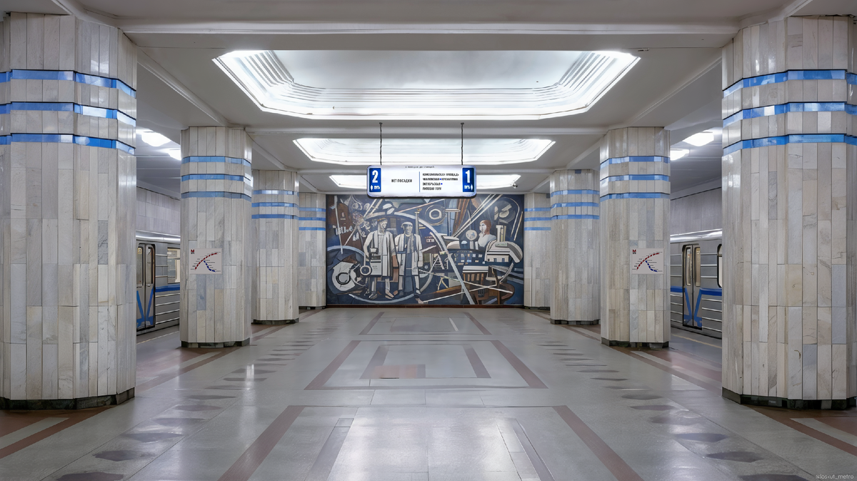 В первую очередь передаю привет моим дорогим 167-ми подписчикам. Вы читаете статью из проекта «Пермское метро, если бы его построили в 80-е и продолжили строить в 90-е». Если вы не понимаете, что происходит, то рекомендую прочитать эту статью. Предупреждение: я не строитель и не архитектор. Я просто любитель метро. Все созданные мною изображения являются выдумкой и созданы для того, чтобы вы улыбнулись и помечтали (ну или взгрустнули). Во вселенной Пермского метро началась новая эпоха — продолжение стройки в 90-х. Следующая станция — «Политехническая». Она соединяет две линии и два времени — советскую эпоху и рождение новой, постсоветской архитектуры метро. По названию можно догадаться, что станция находится недалеко от Пермского Политеха, а также является пересадочной станцией на станцию «Комсомольский проспект» первой линии. Станция строится в новом десятилетии, когда монументальность начала уступать место функциональности и свету. Зал отделан светло-серым мрамором с прожилками, созд