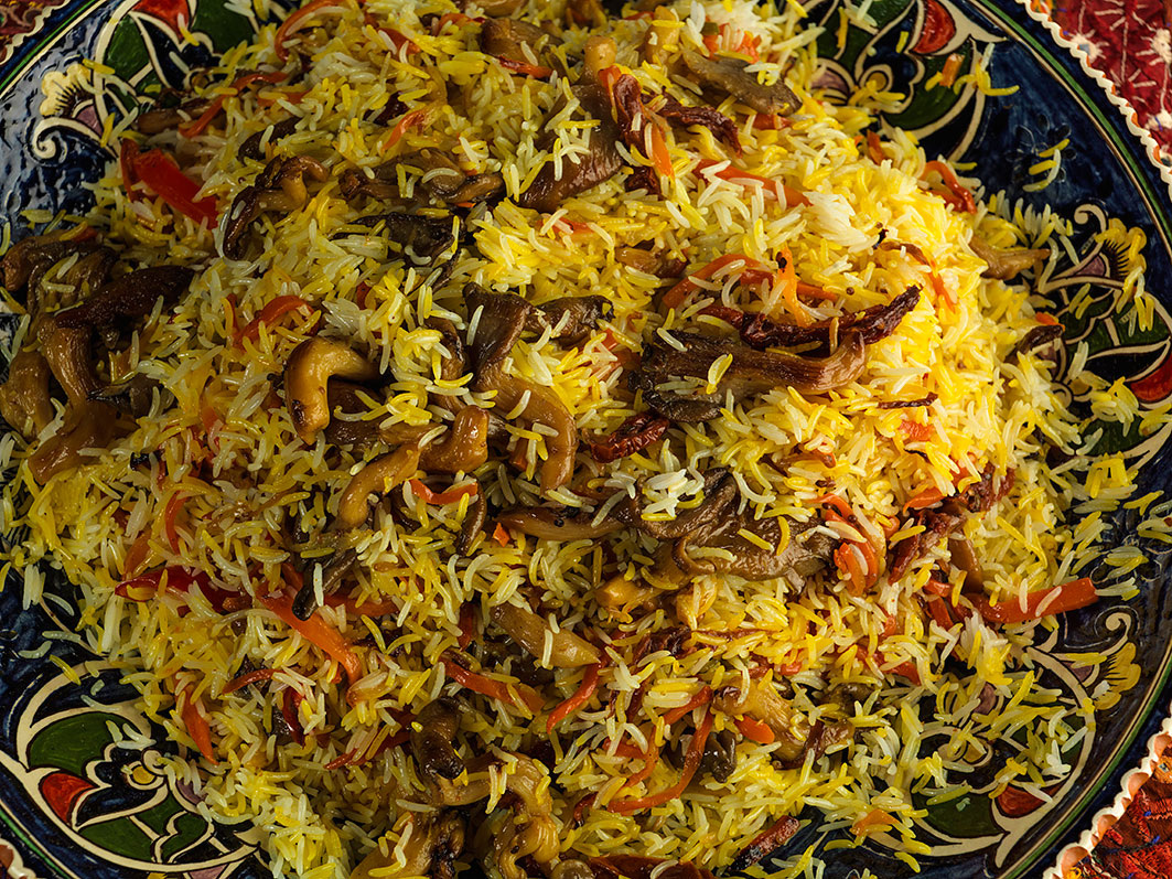 Вы понимаете - порезать морковь, как обычно, только количеством в два раза меньше, лук, только не кольцами, как обычно, а по меридиану - перышками, ну и кое-что из непривычного для плова. Например, половину болгарского перца и половину зеленого чили без семян и перегородок. Вынуть из банки и порезать вяленые томаты в масле. Вешенки отварить в подсоленной воде пять минут, опуская их ножками вниз, а потом откинуть их на дуршлаг и, когда остынут, порвать руками на удобные куски. Почистить головку молодого чеснока и наломать немного сухого чили. Да, я тоже думал, что будет очень остро. А оказалось, что испанский перец только пахнет задорно, а класть его можно и побольше - будет только вкуснее. И все! Тут в кухню входишь ты, на белом коне, весь в белом, разогреваешь казан на пламени,