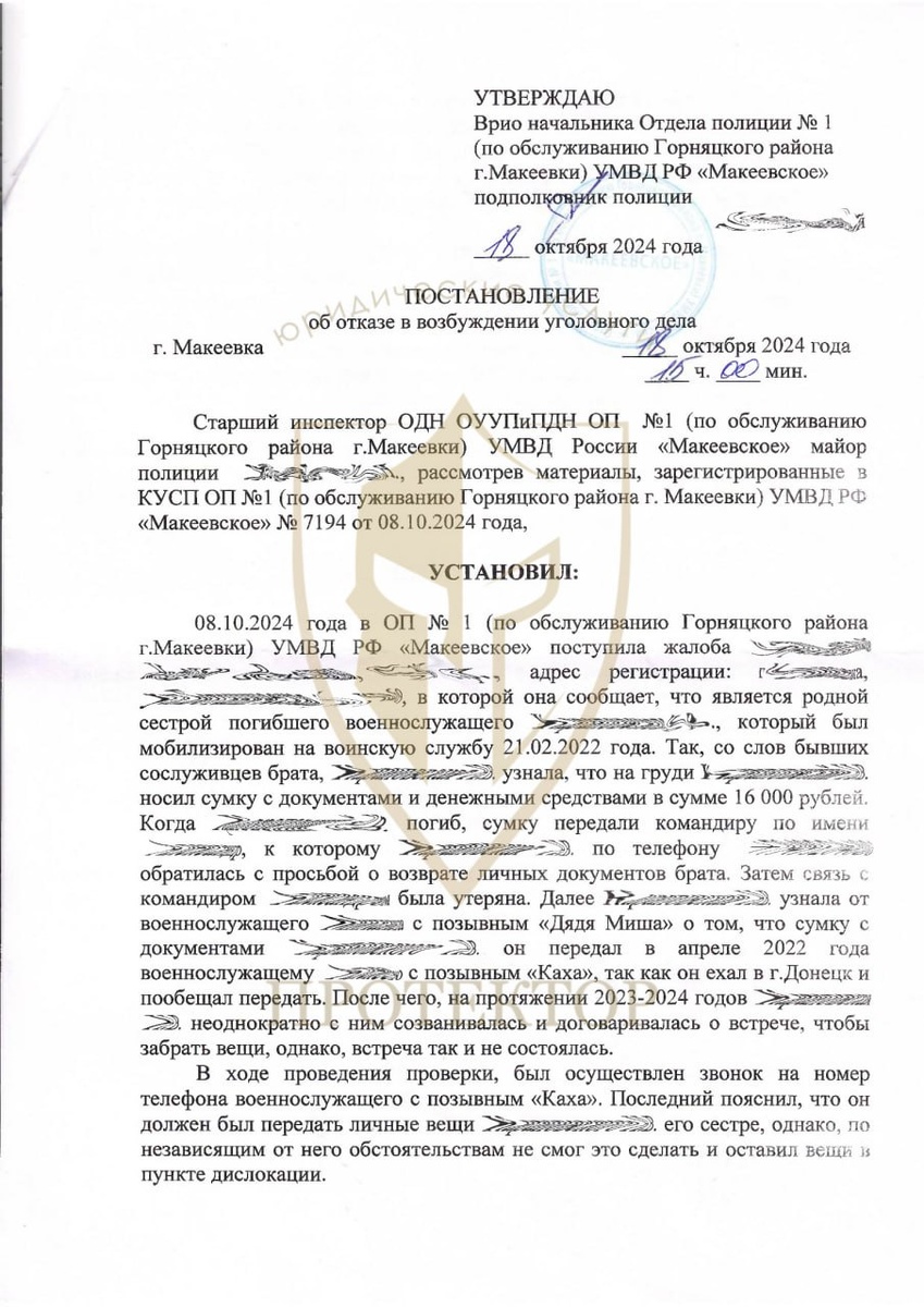 Возврат личных вещей, документов и денег Юристы ЮК «Протектор» помогли сестре погибшего военнослужащего. После смерти брата она никак не могла добиться возврата его личных вещей, денег и документов. После вмешательства наших юристов все заявленное было возвращено под Расписку.