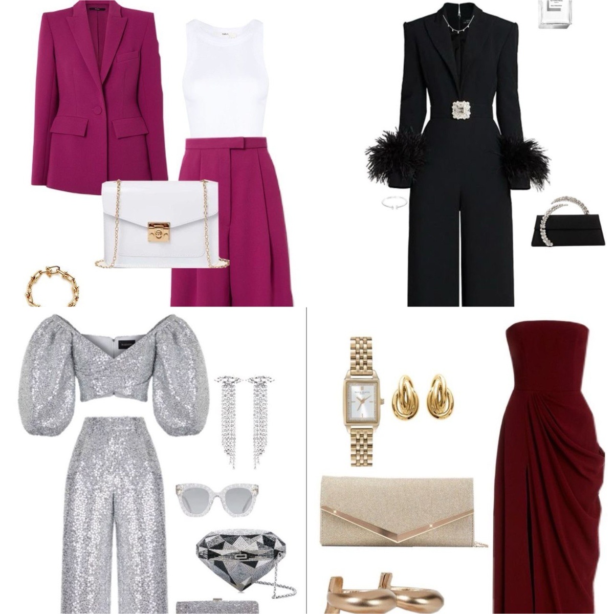 - Для нее: Бархатное платье-футляр, атласный комбинезон или пышная юбка цвета фуксии. Такой образ самодостаточен, добавьте только серебристые аксессуары.
