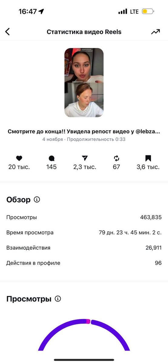 Инструкция: у вас залетел рилс — что делать? Погодите закатывать глаза, типа «Что значит "что делать"? Лучше расскажи, как сделать так, чтобы он в принципе залетел??» Об этом я сняла отдельное видео, выпустим завтра ❤️ А пока скажу, что сделать виральный ролик — не такая уж проблема. Гораздо сложнее этот трафик «оседлать» С легкостью докажу вам это: посмотрите, как много крошечных аккаунтов имеют хотя бы один ролик на 100-200-500к просмотров и больше! Дало ли им это что-то? Скорее всего, нет, кроме дофамина в моменте его залёта от количества лайков и репостов Вот я сегодня проснулась, а у меня на вчерашнем ролике уже 90 тысяч просмотров. Что делаю первым делом: 1️⃣Чекаю шапку профиля! Я тут же поменяла вариант с продающего на цепляющего на подписку. До этого у меня стоял призыв на анкету предзаписи, сейчас поменяла на тот, что продает меня как личность Итог: 100к просмотров → 10 подписчиков с 400к → уже +80 (конверсия подросла) потому что люди переходят в блог и их цепляет т