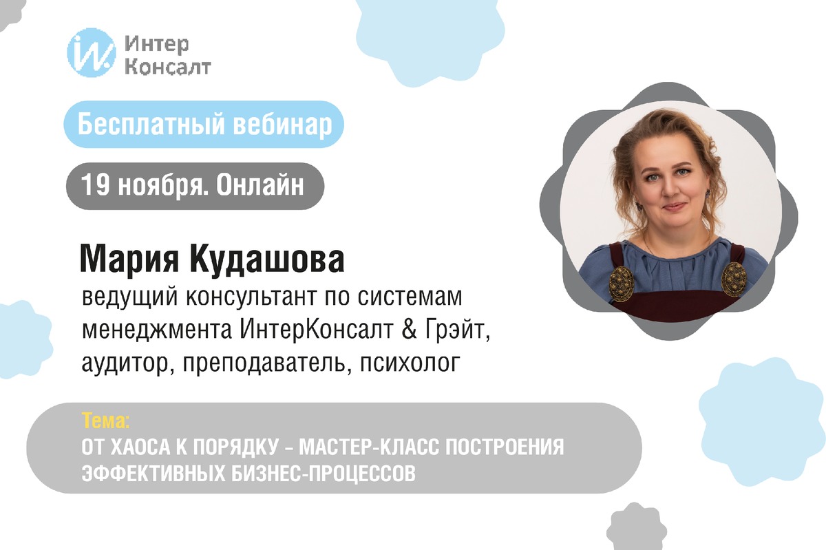 Не упустите возможность присоединиться к вебинару, основанному на более чем 19-летнем опыте обучения и внедрения систем менеджмента на предприятиях различной численности. В течение одного часа вы познакомитесь с основными понятиями систем менеджмента и процессного управления, узнаете, как анализировать и контролировать работу процессов в рамках стратегического управления. Присоединяйтесь, чтобы быть в курсе новых требований и обеспечить соответствие вашего бизнеса актуальным стандартам! Бесплатный обучающий вебинар продолжительностью 1 час состоит из трех модулей и включает в себя теоретическую часть, практические примеры, статистические данные, общение с экспертом в чате. Введение Процессы в системе процессного управления Общие требования к системе процессного управления Мария Кудашова, ведущий консультант по системам менеджмента ИнтерКонсалт & Грэйт, аудитор, преподаватель, психолог. Владеет методиками ускоренного обучения Accelerated Learning. Имеет сертификаты ведущего аудитора и