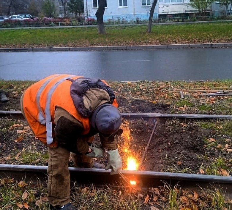 🔧Путейцы «Ульяновскэлектротранса» проводят сезонную регулировку рельсовой колеи - осенью дожди и ночные заморозки сильно влияют на
