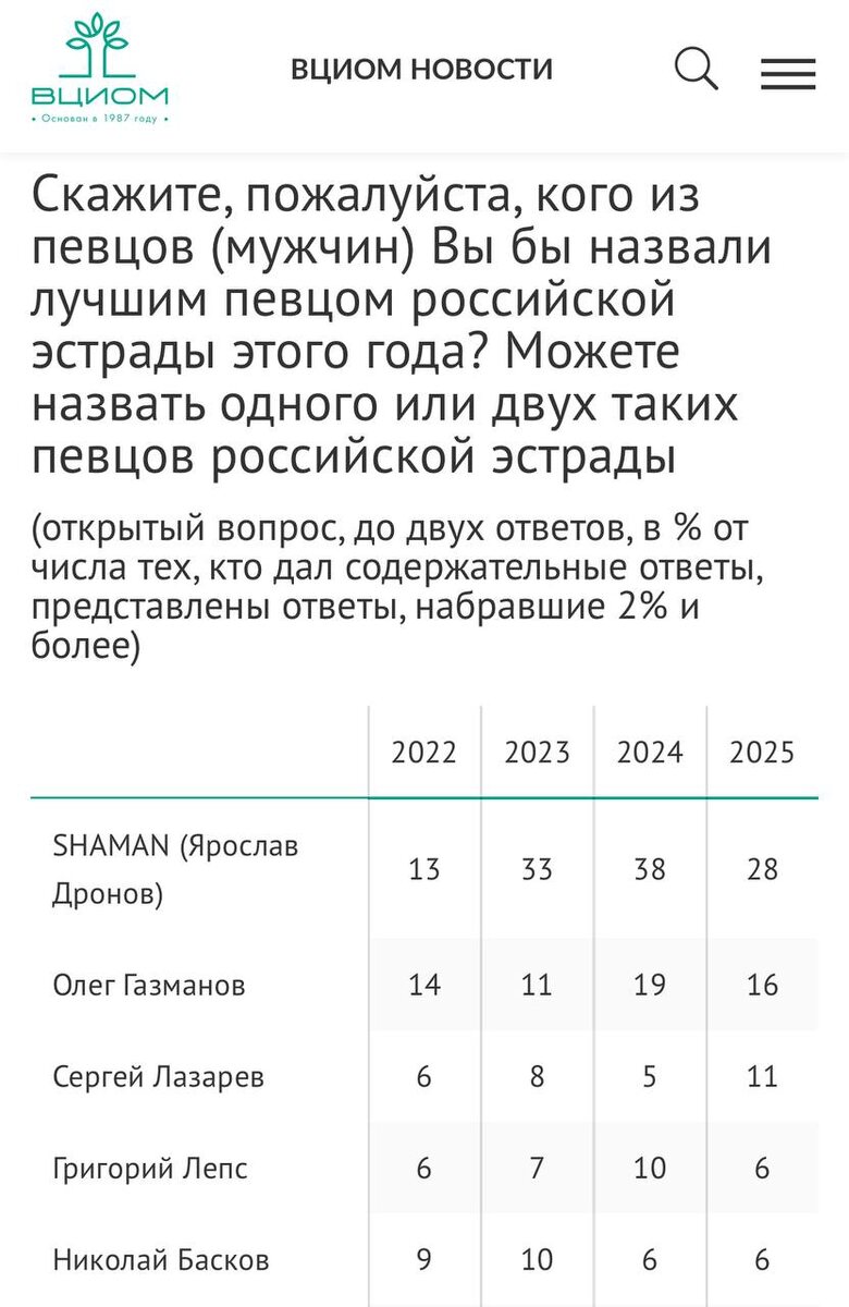Шаман снова признан лучшим певцом России по версии россиян Россияне в третий раз подряд удостоили Шамана звания лучшего исполнителя страны. ────────── ⚡️Важные новости – без лишнего шума!⚡️ Подпишись на канал и получай только суть: оперативно, чётко, по делу! 👉 ИнфоСплетник | @infospletnik