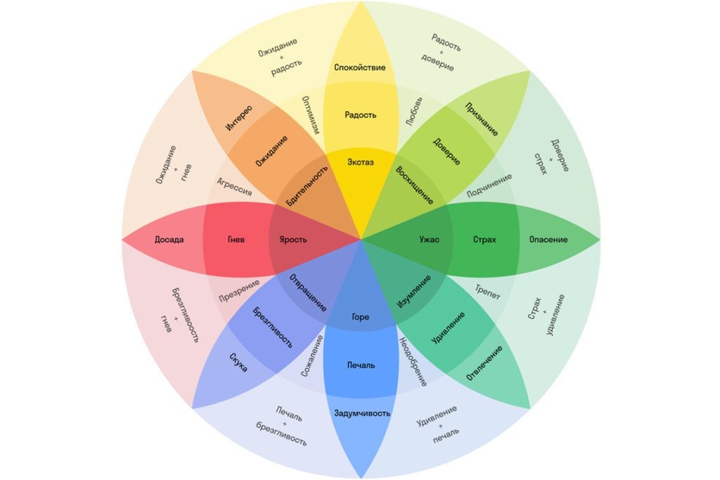 ⭕️ Колесо эмоций. Перед вами колесо эмоций. С ним очень удобно разбираться в своих чувствах и работать с ними. Также его можно использовать в работе с клиентами, если вы психолог. ✏️ Устроено оно следующим образом. В центре — шесть базовых сильных чувств (страх, гнев, печаль, радость, удивление, отвращение). По мере удаления к краю интенсивность снижается и проявляются оттенки чувств, модальности переживания. Соседние лепестки обозначают типичные смеси и переходы: страх, соединяясь с удивлением, рождает изумление; гнев, примешанный к ожиданию, превращается в настойчивость. Противоположные сектора — полюса наших чувств. Противоположное чувство — это то, что вытесняется актуальным состоянием, но часто содержит недостающий ресурс (напротив гнева — страх, напротив печали — радость). Колесо полезно для разных задач: быстрой самодиагностики («что со мной сейчас»), перевода эмоции в потребность («что мне на самом деле нужно») и выбора дальнейших шагов в связи с создавшимися ситуациями