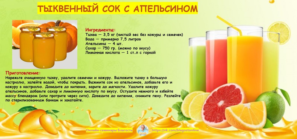 🍊 ТЫКВЕННЫЙ СОК С АПЕЛЬСИНОМ 🌀 Ингредиенты: Тыква — 3,5 кг (чистый вес без кожуры и семечек) Вода — примерно 7,5 литров Апельсины — 4 шт Сахар — 750 гр (можно по вкусу) Лимонная кислота — 1 ст.л с горкой 🌀 Приготовление: Нарежьте очищенную тыкву, удалите семечки и кожуру. Выложите тыкву в большую кастрюлю, залейте водой, чтобы покрыть. Выжмите сок из апельсинов, добавьте его и кожуру в кастрюлю. Доведите до кипения, варите до мягкости. Удалите кожуру апельсинов, добавьте сахар и лимонную кислоту по вкусу. Остудите немного и взбейте массу блендером (или протрите через сито). Доведите до кипения, снимите пену. Разлейте по стерилизованным банкам и закатайте.