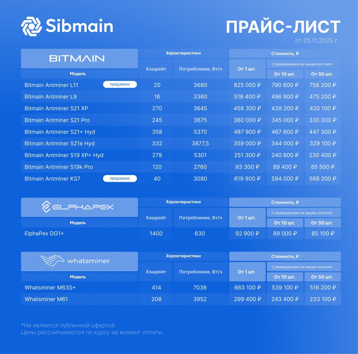💲Актуальный прайс-лист на 05.11. Sibmain комплексные решения для майнинга под ключ! - Поставки майнинг оборудования - Дата-центр в Красноярске 80 МВт - Размещение от 5,4 руб/кВтч ⌨️ Нужна консультация или помощь в подборе оборудования? Звоните: +7(937)544-44-43 📍 г. Москва Калужская площадь д.1 к.1 💬 WhatsApp 💬 @Sibmain_salesbot 🌐 sibmain.ru