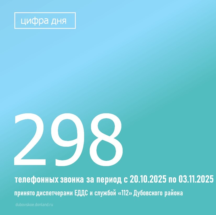 За период с с 20.10.2025 по 03.11.2025. дежурными сменами Единой дежурно-диспетчерской службы Дубовского района всего было принято 144 вызова из них: 🔘в ЕДДС – 3 вызова. 🔘в Систему-112 – 295 вызова. Принято вызовов в экстренные оперативные службы: 🚒 пожарную охрану –0; 🚓 полицию – 10; 🚑 скорую медицинскую помощь – 23; ♨️ газовую службу – 0. Других обращений, в том числе снижающих качество работы службы - автодозвоны, детская шалость, хулиганские вызовы, ложные вызовы, справочные, а также не требующие оперативного реагирования, на номер «112» поступило – 243. 📞Напоминаем, ЕДДС работает в круглосуточном режиме. Телефон:8(86377)20376 #Служба112 #ЕДДС #ГОиЧС #цифрадня #ДубовскийрайонРостовскаяобласть