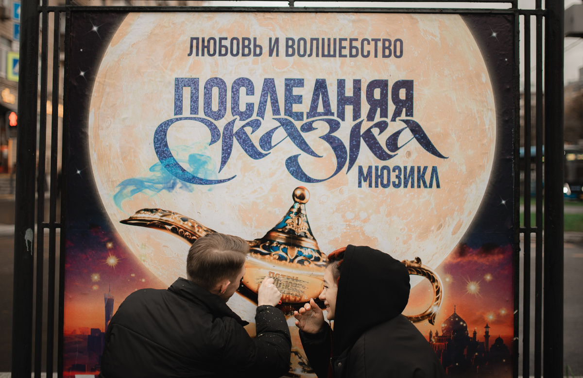 К годовщине «Последней сказки», на стендах Москвы появилась интерактивная реклама мюзикла. Если потереть нарисованную волшебную лампу, то джинн, конечно, не выскочит, но на поверхности проявится многоразовый промокод на скидку, который можно применить на официальном сайте «Бродвей Москва» при покупке билетов. «Люди устали от рекламы, которая общается с ними монологом. Мы хотели создать диалог, игру, тактильное переживание. Идея «потереть лампу» – это геймификация городской среды, рождающая личный контакт между человеком и брендом. Решение похоже на лотерейные билеты со скретч-слоем, только в нашем случае выигрывают все», – считает PR-директор «Бродвей Москва» Инна Красильникова. По мнению Инны, такое взаимодействие не только донесет до зрителя выгоду, но и передаст дух самого спектакля: «Последняя сказка» – история о том, что даже в современном мире есть место чуду, нужно лишь захотеть его совершить. Интерактивные стенды могут стать точкой притяжения и поводом для спонтанного взаимодей