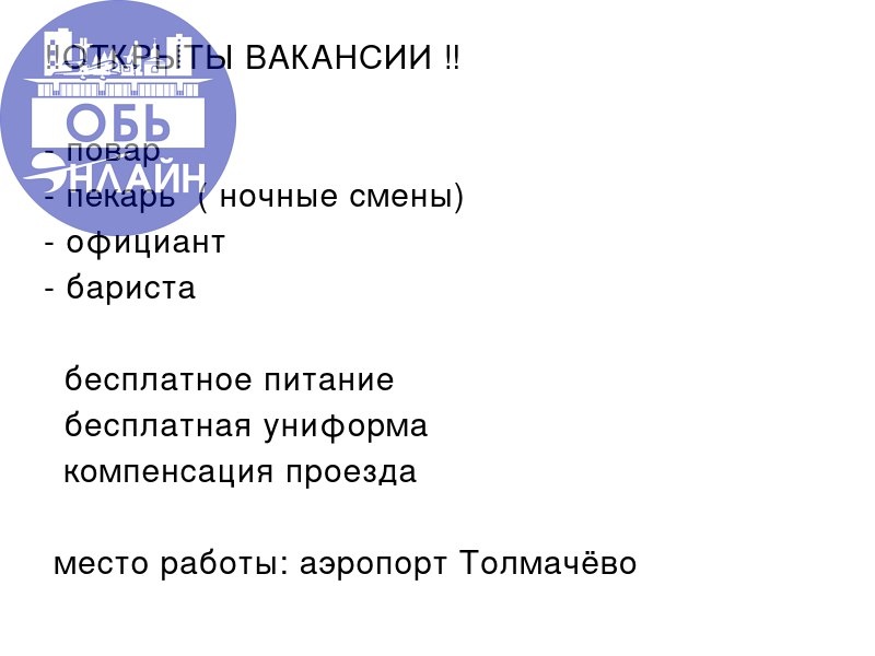 ↗ ‼️ОТКРЫТЫ ВАКАНСИИ ‼️ - повар 🧑🍳 - пекарь 🥐( ночные смены) - официант 🍽️ - бариста ☕️ 💚 бесплатное питание 💚 бесплатная униформа 💚 компенсация проезда 📍место работы: аэропорт Толмачёво ✈️ 📲 8-913-066-96-97 #Reklama@ob.gorod vk.ru Подробнее на https://vk.com/ob.gorod #городобь #городобьонлайн #толмачево
