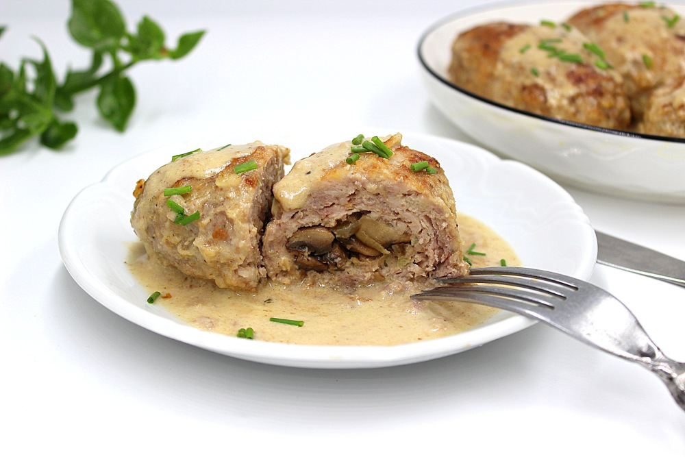Пищевая ценность на 100 г Калории 213 ккал Белки 9.4 г Жиры 9 г Углеводы 24.7 г Ингредиенты: Фарш мясной – 500 г Шампиньоны – 170 г Лук репчатый – 150 г Яйцо куриное – 1 шт. С1 размер Сухари панировочные – 50 г Бульон – 150 г Сливки – 120 г 33% Порошок чесночный – 1 щепотка (-и) Майоран – 0.5 ч.л. Грибы – 1 ч.л. сухие, молотые Мука пшеничная – 1 ч.л. Смесь перцев – 0.3 ч.л. Соль – 7 г по вкусу Масло оливковое – 2 ст.л. Рецепт: Подготовить ингредиенты для зраз мясных с грибами на сковороде. Шампиньоны промыть и нарезать примерно 1- 1,5 см кубиком. Половину луковицы нарезать кубиком для начинки, а вторую половину натереть в фарш. С добавлением ложки масла обжарить шампиньоны и лук. Чуть посолить. В фарш добавить половину сухарей, майоран, яйцо, чесночный порошок, смесь перцев и соль. Фарш хорошенько перемешать и слегка отбить, до вязкости и гладкости. Разделить фарш примерно на 5 частей. На мокрой ладони расплющить фарш в лепёшку и положить ложку начинки. Сформировать зразу и обваля