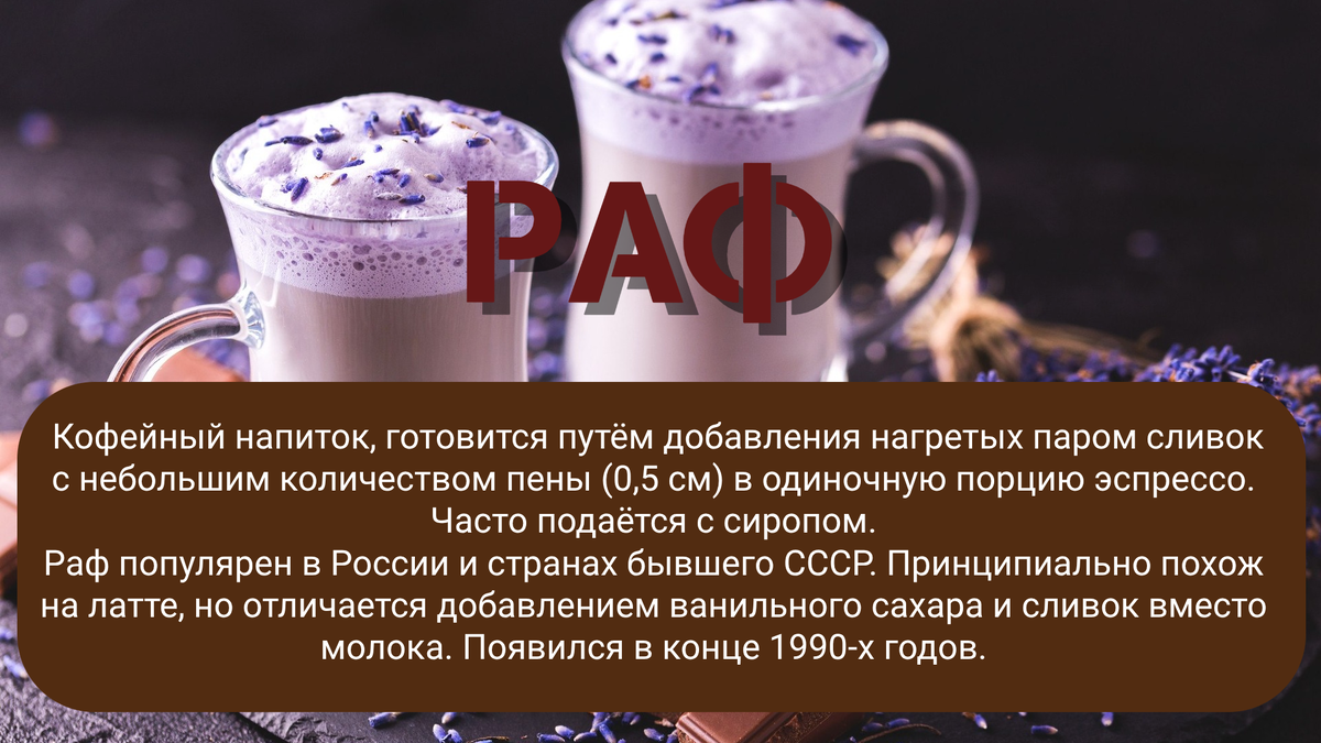 Согласно легенде, раф-кофе появился в московской кофейне «Coffee Bean» в конце 1990-х годов. Постоянный клиент Рафаэль попросил бариста придумать что-то новое. Глеб Невейкин, Артём Берестов и Галина Самохина создали напиток, который был мягче и слаще традиционного кофе с молоком. Его назвали «кофе для Рафа». Со временем посетители стали запрашивать «кофе как для Рафа», и наименование сократилось до «раф-кофе» или просто «раф». Когда бариста начали работать в других кофейнях, раф-кофе быстро завоевал популярность по всей России. Сегодня он один из самых любимых кофейных напитков в Москве и за её пределами. К 2018 году раф стал известен и в Украине, Казахстане и Беларуси. За пределами СНГ этот напиток практически не известен.