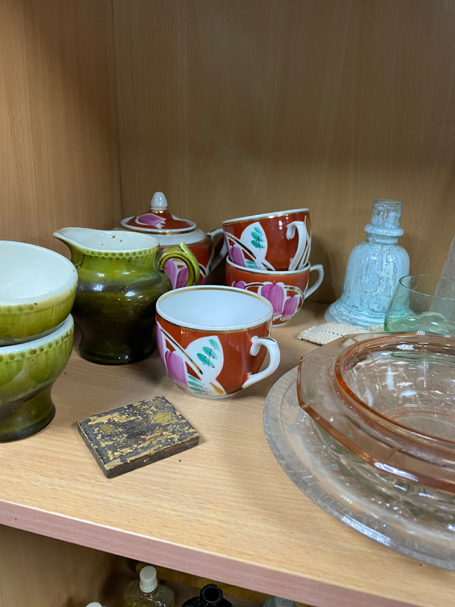 Антикварные лавки в Тарусе я уже как-то посещала. Года два назад мы ездили в Поленово и заодно на кораблике сплавали в этот славный уездный городок. А на ноябрьских праздниках мы отдыхали в Калужской области. И путь проходил как раз аккурат мимо Тарусы. Такую возможность упускать никак нельзя, надо обязательно завернуть ради винтажной охоты) Посетила я три магазинчика. В первом совершенно ничего мне не приглянулось. Тройка советских фотоаппаратов, значки, керамические кружки…Был один красивый молочник, абсолютно точно антикварный, но такой весь-перебитый, что смотреть жалко🫣Ну, видно, и такое покупают. Во втором шла то ли перестановка, то ли инвентаризация. Все винтажы почивали в коробках и сундуках. Из того, что не успели еще убрать, был довольно любопытный сервиз Вербилок. Точнее то, что от него осталось. 4 чашки и сахарница, клеймо Лось. Роспись ручная, известная, «Колокольцы» К. Н. Паниковой, на необычном терракотовом крытье. Впервые мне такое сочетание встречается, и предположу
