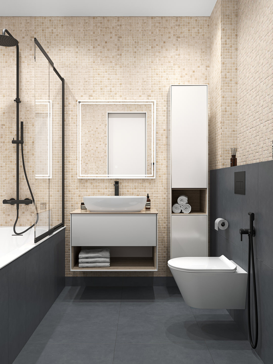 Каждый ремонт индивидуален – при этом многое определяется площадью помещения. Особенно справедливо это для санузла, где красоту и удобство нужно создать буквально на нескольких квадратных метрах. В сегодняшней статье рассмотрим пять решений для типовой площади, характерной для многих российских новостроек. 1. Красота мозаики Современный дизайн интерьера складывается из мебели в санузел, сантехники и керамической отделки, от которой во многом зависит восприятие пространства. Данный проект выполнен для ванной комнаты площадью 4,4 кв. м. Выбор между ванной и душевой зоной сделан в пользу ванны, готовой буквально погрузить в атмосферу приятного отдыха. В интерьере есть всё, что составляет основу обстановки санузла: это раковина «Плаза» (Plaza), тумба «Плаза Модерн» (Plaza Modern), зеркало «Текно» (Tecno) с подсветкой и функцией антизапотевания, а также унитаз «Плаза Модерн». Такое пространство позволяет использовать и другие решения, в том числе подвесной или напольный пенал. Мозаичное пок