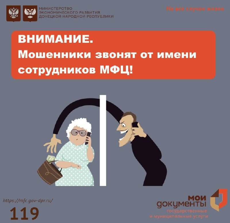 📞Внимание! Мошенники звонят от имени МФЦ! 🟡Никогда не сообщайте личные данные по телефону 🟡Уточните информацию самостоятельно, используя официальный номер Контакт - центра МФЦ ДНР — 📞119 🟡Если вам кажется, что звонок подозрительный, лучше завершите разговор. Помните, ваша бдительность – лучшая защита! Берегите себя и своих близких! С уважением, МФЦ ДНР 📑 Источник:https://t.me/mfc_dnr