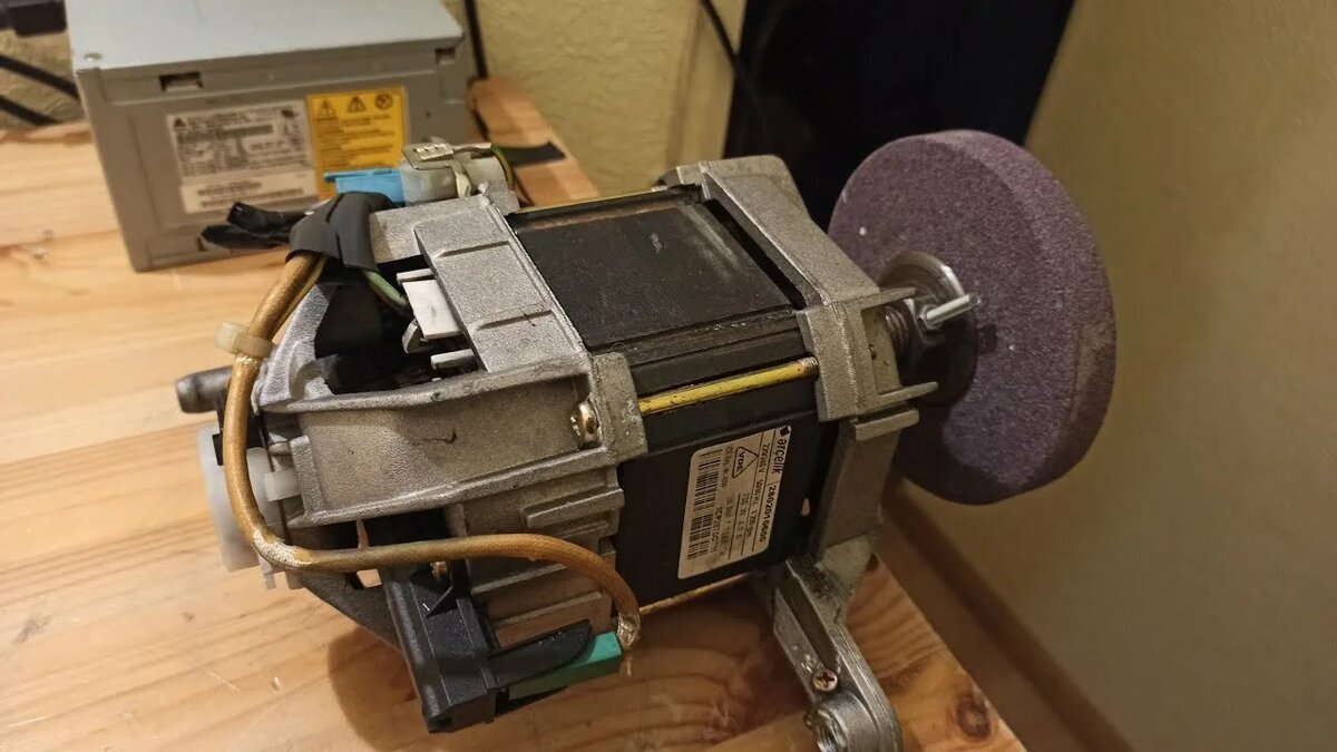 Коллекторный двигатель. Ставится на большинство современных машин-автоматов. Его главное преимущество — **высокие обороты** и возможность их плавной регулировки с помощью простого регулятора напряжения (диммера). Такой мотор — лучший выбор для точильного станка, шлифовального диска или любого инструмента, где нужна скорость.