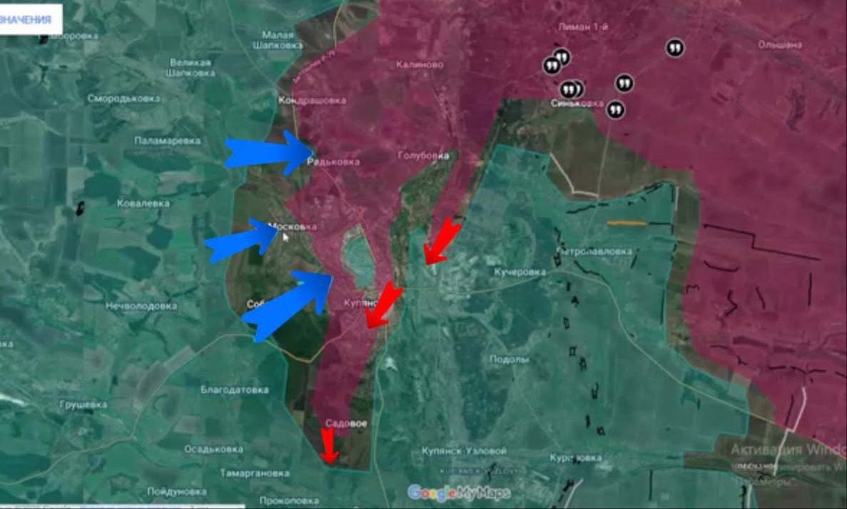 ❗️🗺Подразделения ГрВ "Запад" развивают наступление на Купянском направлении На Купянском направлении продолжаются успешные наступательные действия российских подразделений. Южнее линии Купянск-Кучеровка наши войска установили контроль над территорией бывшего завода между населенными пунктами и ведут операцию по окружению группировки противника в районах Подолы и Петропавловка. Особое внимание уделяется установлению контроля над автомобильной трассой, связывающей Петропавловку и Степовую Новосёловку. В самом Купянске украинские формирования остаются в оперативном окружении. Командование ВСУ, пытаясь деблокировать окруженные подразделения, перебрасывает дополнительные резервы в район Соболевки, Московки и Радьковки. Населённый пункт Кондрашовка практически полностью перешёл под контроль российских войск. С этого участка фронта наносятся эффективные удары по выявленным группам ВСУ, предпринимающим попытки атак с северо-западного направления. @bestrussianarms