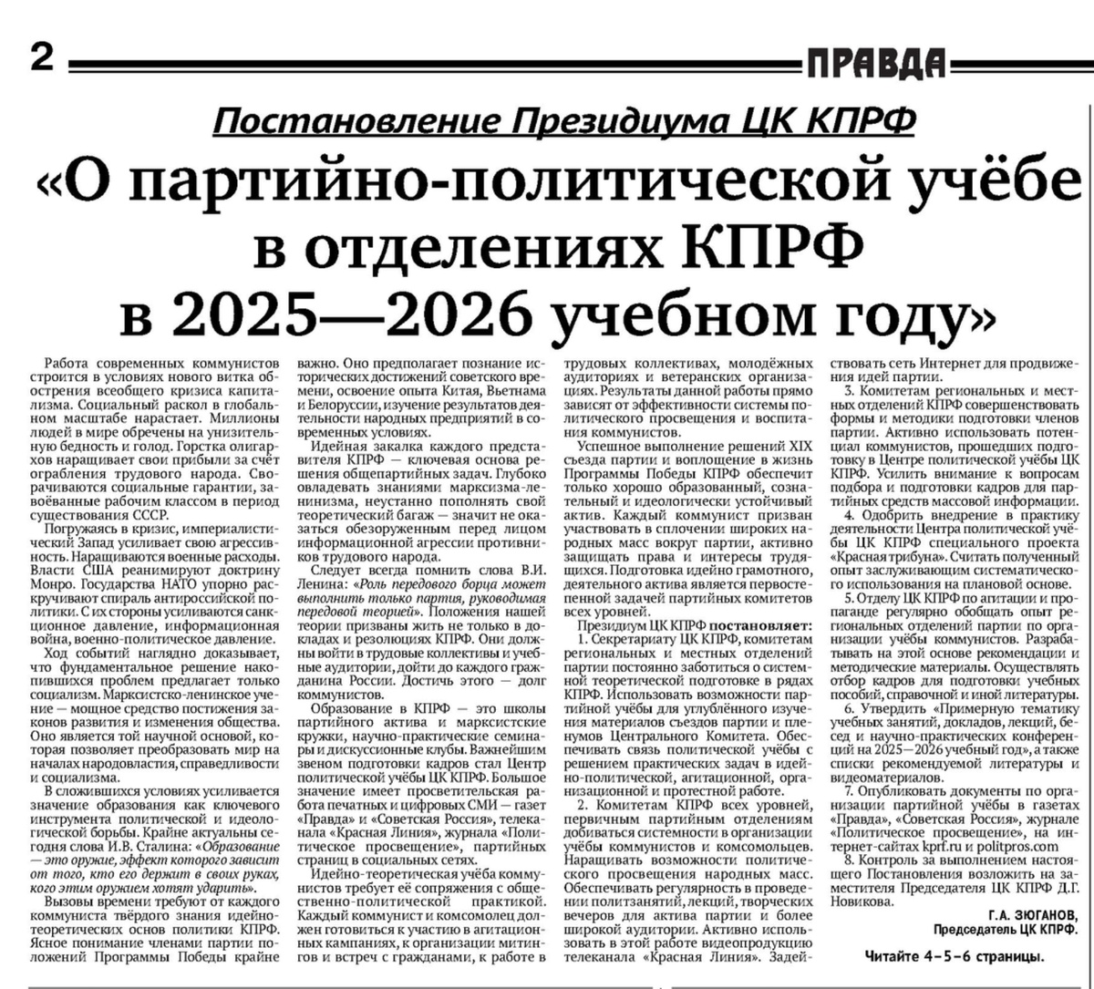 В свежем номере газеты «Правда» опубликовано Постановление Президиума ЦК КПРФ «О партийно-политической учёбе в отделениях КПРФ в 2025 - 2026 учебном году» и утверждённая Примерная тематика учебных занятий, докладов, лекций, бесед и научно-практических конференций на 2025 - 2026 учебный год. Сегодня идейная борьба становится особенно острой. Крупный капитал усиливает информационное давление, стремясь переписать историю, обесценить советский опыт и размыть историческое сознание общества. Именно поэтому партия подчёркивает решающую роль знаний и идеологической подготовки. «Образование - это оружие, эффект которого зависит от того, кто его держит в своих руках, кого этим оружием хотят ударить». - И.В. Сталин Эта мысль - ключ к пониманию задач партийной учёбы сегодня. Учёба в КПРФ не формальность и не теория ради теории. Это подготовка к практической борьбе: к работе в трудовых коллективах, к агитации, к разъяснительной работе среди молодёжи, к защите интересов народа.
