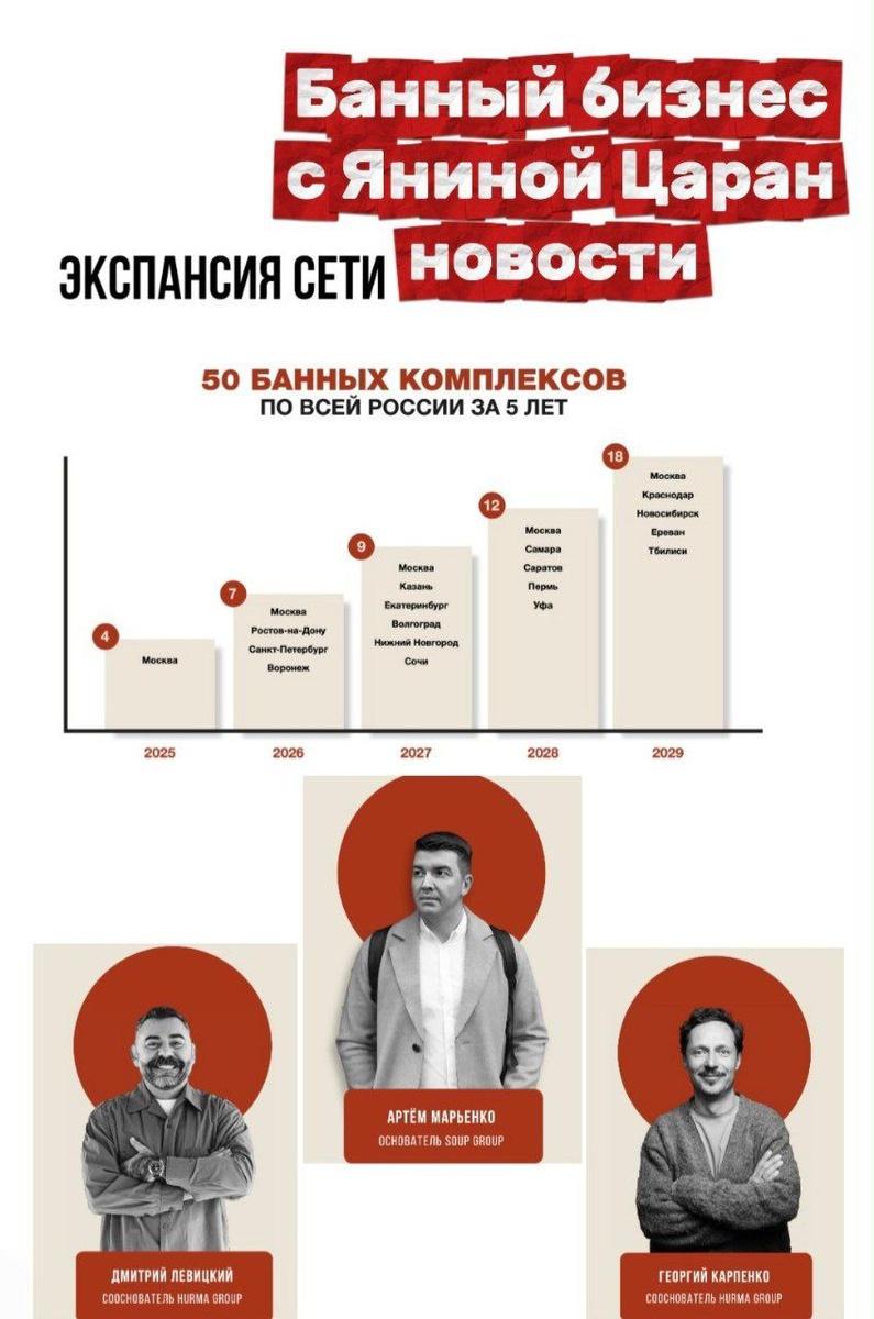 Готовят запуск 50 новых БК. Видели? Новые игроки банного бизнеса Рестораторы готовят к запуску Сеть Городских бань "Дружба". За 5лет по плану открыть 50 банных комплексов. В 2025 году плановый запуск в Мск первого банного комплекса. Ресторанная группа компаний HURMA GROUP OF COMPANIES начали открывать вакансии. К примеру менеджер в мужские бани "Дружба" ЗП 125 тыс. У них создана своя УК и открылось предложение стать инвестором. О проекте: Комфорт + (класс общественных бань) 900-1500 м2 (площадь одной бани) Локации там где отсутствуют конкуренты поблизости. Входной билет 2500-3000 ₽ Средний чек кухни 2500 ₽ Средний чек услуги 3000 ₽ Концепция 60-80 чел гастроли банных команд демократическая атмосфера без пафоса кислород в общей парной открытая терраса Банный бизнес с Яниной Царан