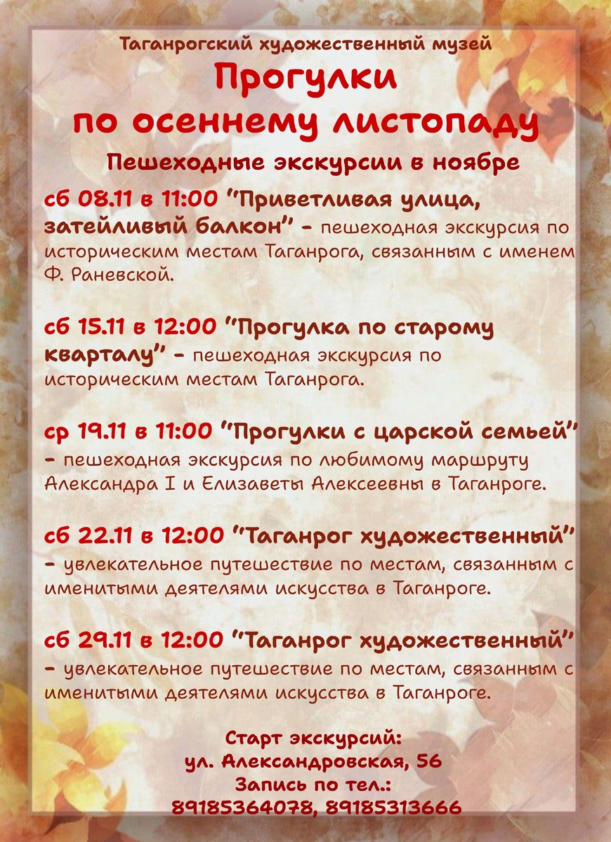 🏛Дорогие друзья! 🍁🍁🍁🍁🍁🍁🍁🍁🍁🍁🍁🍁🍁🍁🍁🍁🍁🍁🍁🍁🍁🍁🍁🍁🍁🍁🍁🍁Для всех любителей познавательных душевных прогулок по городу вместе с художественным музеем мы предлагаем ноябрьскую программу пешеходных экскурсий по субботам. По многочисленным просьбам посетителей мы включили экскурсии, вызвавшие наибольший интерес. ‼Успейте записаться, места еще есть! Тел. 89185364078, 89185313666 старт экскурсий — ул. Александровская, 56 #пешеходные_экскурсии_ТХМ #таганрогский_художественный_музей