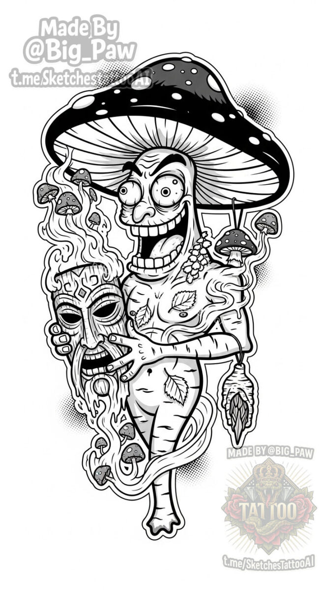 #2806 Подборка по запросу подписчика - сделать пару эскизов на тему : шаманизм древней Руси,расширение сознания с помощью волшебных грибов, что то типа такого 🧠 SYNTX - тут создан эскиз 💎 Информация - все услуги 💀 Эскизы от нейросети #шаманы #грибы #психодел #эскиз #тату #татуировка