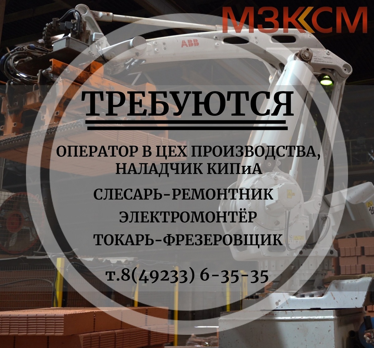 #работа АО «МЗКСМ» на ст. Мстера приглашает в дружный коллектив на постоянную работу со стабильно высоким заработком: -️ оператора в цех производства кирпича; - наладчика КИПиА; -️ слесаря-ремонтника; -️ электромонтера; - токаря-фрезеровщика. 📍 Проезд служебным автобусом из г. Вязники, п. Мстера, п. Лукново. 📞 Тел 8 (49233) 6-35-35.