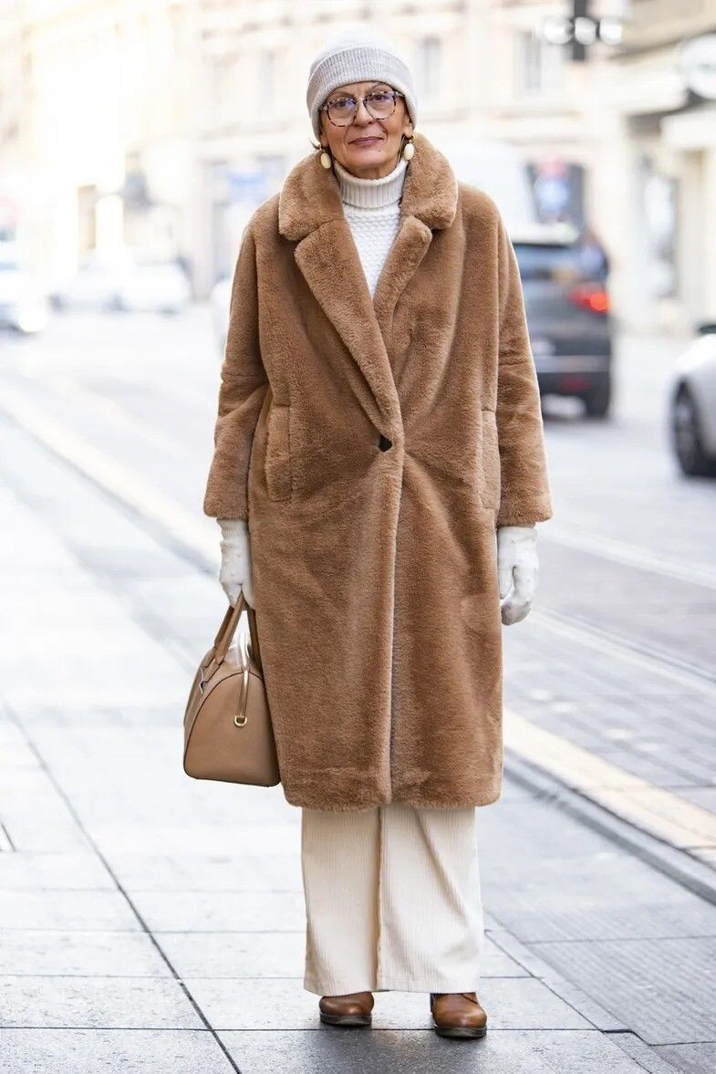 Зимой нужно прежде всего одеваться комфортно и тепло? Такие утверждения остались в далеком прошлом, ведь современные зимние образы помимо практичности учитывают еще и такой важный параметр как привлекательность и стильность. Женщины 60+ зимой 2025 года будут одеваться по-разному – сдержанно, ярко, оригинально, но никогда – скучно и сугубо утилитарно. 1. Стильный образ для модниц старше 60, предпочитающих наряды в сдержанной и элегантной цветовой гамме с лаконичными линиями – это светло-бежевые брюки прямого кроя и белый свитер плотной вязки с высоким воротом, дополненные длинным и теплым кофейно-коричневым меховым пальто и коричневыми ботинками на плоском ходу. Светло-серые перчатки и вязаная шапка завершат образ, добавляя ему одновременно и изящества, и современности. 2. Изысканное шерстяное пальто трендового оттенка сливочного масла – выбор стильных и смелых зрелых дам. Смелых, потому что максимально эффектно такое пальто будет смотреться, если дополнить его ярко-вишневыми высокими к