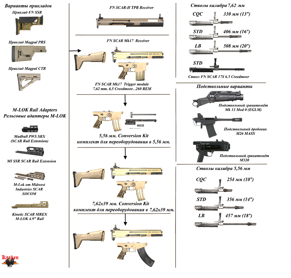 Комплект конвертации SCAR Mk17 под патрон 5.56 мм. включает в себя нижнюю ствольную коробку «Lower» с ударно-спусковым механизмом, затворную раму, затвор и возвратную пружину.