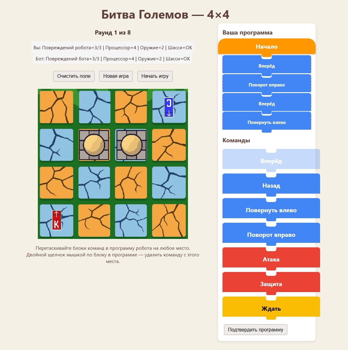 иА у нас тут.... Альфа версия Битвы Големов. Да не простой, а с ИИ моделью qwen3 14B. https://simplrobot.ru/bg_ai_game Ставьте на поле своего робота и противника, несколько камней (можно на пустом поле) и запускайте битву кнопкой "Начать игру". Далее перетаскивайте команды в программу, подтверждайте ее и затем ждите пока Бот придумает свою, а после пошагово смотрите выполнение. У вашего робота 3 жизни и стартовые условия: Процессор на 4 команды, Оружие на 2 единицы и целое шасси. При каждом подтверждении вы можете остаться с 2 слотами для команд, 1 единицей урона или перестать двигаться назад. Потестируем, если будет слишком накладно по токенам и скорости ответа, то вернемся к проверенным алгоритмам путей и небольшому рандому. P.S. Можете поиграть просто с алгортмическим ботом с тремя вариантами поведения: https://simplrobot.ru/bg_bot_game