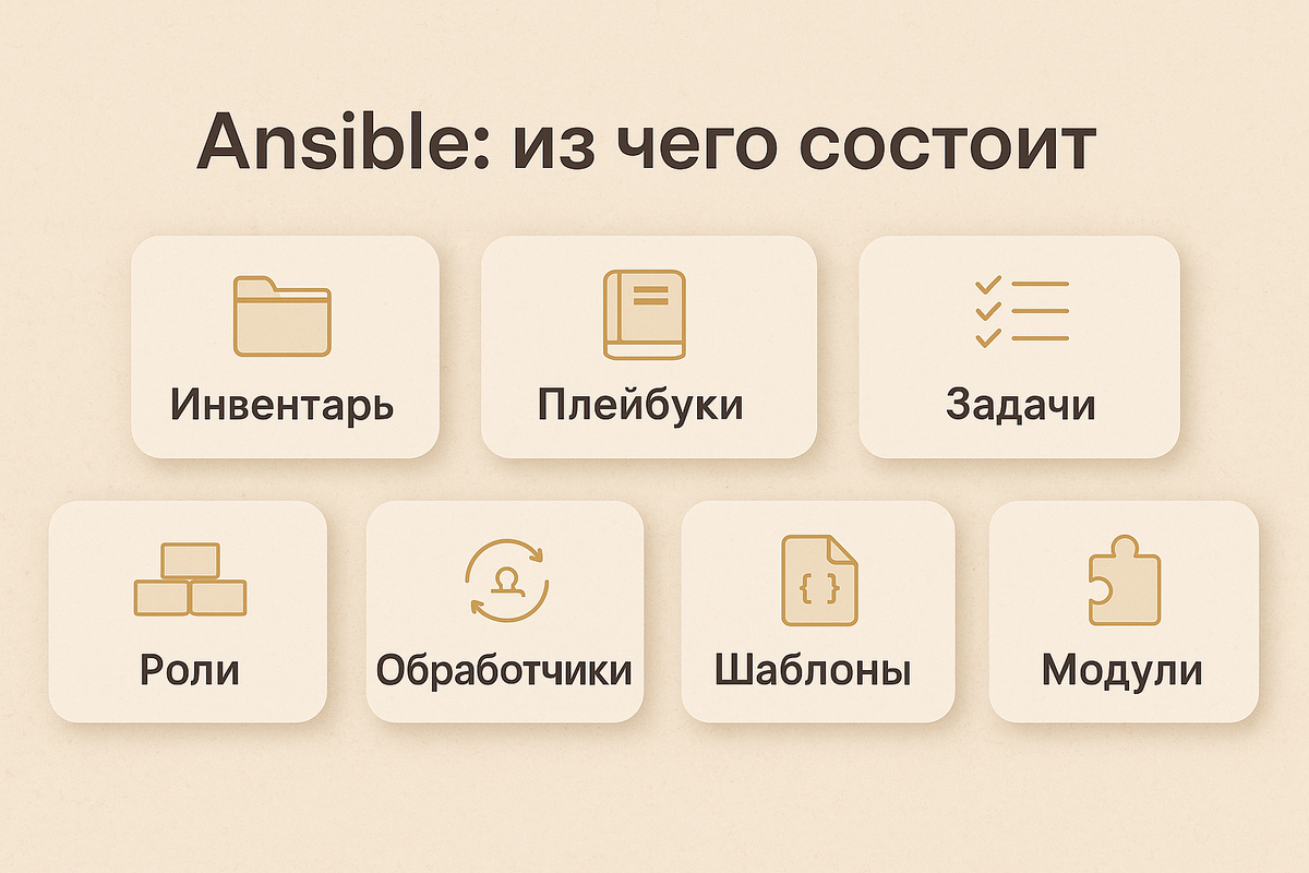 - Посмотрели компоненты: инвентарь, плейбуки, задачи, роли, handlers, шаблоны, переменные, модули — с мини-примерами.