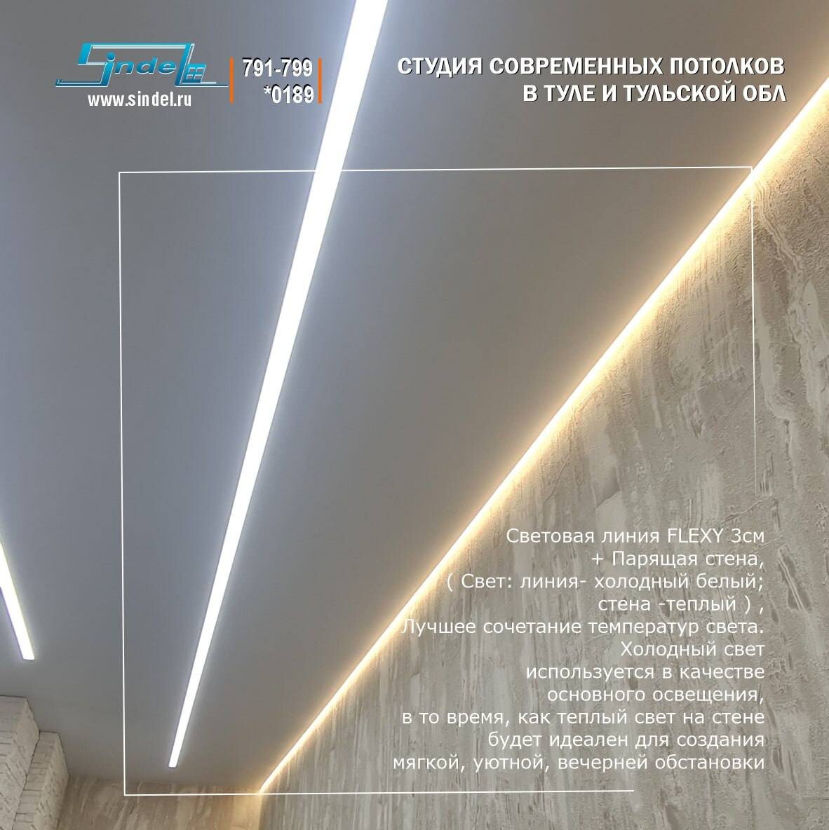 Студия современных потолков в Туле и Тульской обл приветствует Вас 🙏🏻 💡 Представляем Вашему вниманию: Световая линия FLEXY 3см + Парящая стена (Свет: линия — холодный белый; стена — теплый) 🔥 Лучшее сочетание температур света. Холодный свет используется в качестве основного освещения, а теплый свет на стене создаст уютную, вечернюю обстановку. Звоните , подскажем, поможем, сделаем💪🏻 📍 Контактная информация: 📞 791-799 📱 *0189 🌐 www.sindel.ru #СтудияПотолковСИНДЕЛ #Освещение #Дизайн #Тула #ТульскаяОбл #НатяжныеПотолки