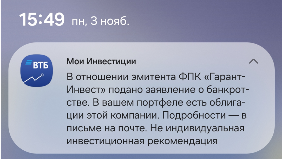 Всем привет! Ну, похоже, началось... Много кто на "ютубах" предрекал банкротства разных компаний в виду высокой ключевой ставки... На днях пришло сообщение о том, что в отношении Гарант-Инвест подано заявление о банкротстве... Печаль, конечно... У меня тоже есть облигации Гарант-Инвест - ГарИнв2P05 (RU000A105GV6) в количестве 5 шт., так что потеряю я немного: Еще в июне 2025 года я подала заявление на обратный выкуп этих облигаций, но до сих пор - ни ответа, ни привета... Хотя... пришло сообщение с "приветом" про банкротство эмитента... Этим же летом я подала еще несколько заявлений на такие же дефолтные облигации, но ситуация такая же - тишина... Я теперь их даже в списке облигаций не вижу... Как мне сказали в отделении банка, где я писала заявления, облигации скрыты, но их можно посмотреть в брокерском отчете. Про то, какие еще у меня дефолтные облигации я рассказывала здесь. Теперь я стала умнее и на купоны, которые все-таки получаю по другим облигациям, покупаю более надежные вари