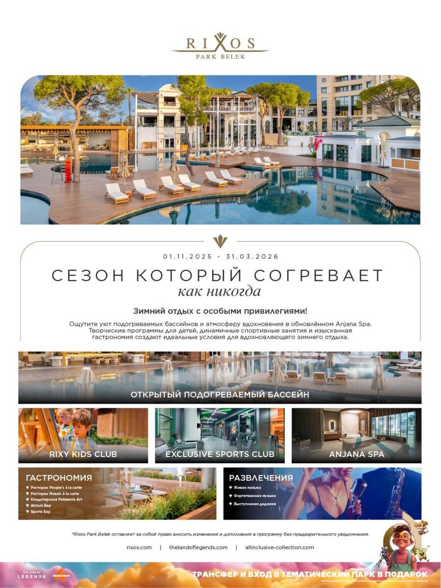 🤩 СЕЗОН, КОТОРЫЙ СОГРЕВАЕТ КАК НИКОГДА 🤩 С 1 ноября 2025 по 31 марта 2026 Rixos Hotels приглашает вас провести зиму в атмосфере уюта, вдохновения и привилегий 🤩 🤩Наслаждайтесь подогреваемыми бассейнами, 🤩восстановите гармонию в Anjana spa, 🤩откройте для себя изысканную гастрономию, 🤩и насладитесь живой музыкой и атмосферой зимнего вдохновения. ✨Особое настроение ждёт вас в период новогодних праздников — с праздничными ужинами, выступлениями артистов и незабываемой атмосферой Rixos! 🎄 Каждый отель rixos в Анталии предлагает особенные впечатления🤩 🤩 Rixos Premium Belek — для тех, кто ценит элегантность 🤩 Rixos Premium Tekirova — семейный уют у моря 🤩 Rixos Downtown Antalya — вдохновение в сердце города 🤩 Rixos Park Belek — баланс спорта, отдыха и тёплых эмоций 🤩И не забывайте: для всех гостей Rixos Анталия — трансфер и вход в тематический парк The Land of Legends в подарок! 🎁 ❄️Ваш зимний сезон начинается здесь — в Rixos. Для ознакомления с программой и деталями —