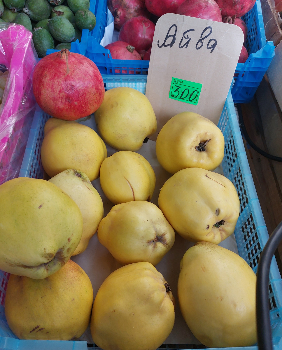 Мечта найти айву и сварить из нее варенье осуществилась. Кто ищет, тот найдет. На нашем сельском рынке не было, на ростовском не было, оставался только краснодарский. И вот сегодня утром, будучи в гостях, решили мы с мужем отправиться на рынок под названием «Витамин». Побродили по его рядам. Много было разных фруктов и овощей. Что-то ниже, чем у нас, что-то по такой цене. Но в основном продают весь набор, что и на всех остальных рынках - помидоры, огурцы, картофель, свекла, морковь. Порадовала цена на мандарины. Почему-то с листиками стоят дороже — 180 рублей. Айву увидела по 300 рублей за килограмм. Продавец сказал, что это из Азербайджана, но мне почему-то хотелось айву именно выращенную в наших садах. Да и цена не очень нравилась, хотя не критично. Если очень хочется, можно и купить. И тут я увидела айву, которая была выращена точно в садах. Уж я-то ее узнаю. И уже, конечно, насекомые тоже хотели полакомиться вкусной натуральной айвой. Но меня это не остановило. Разговорилась с пр