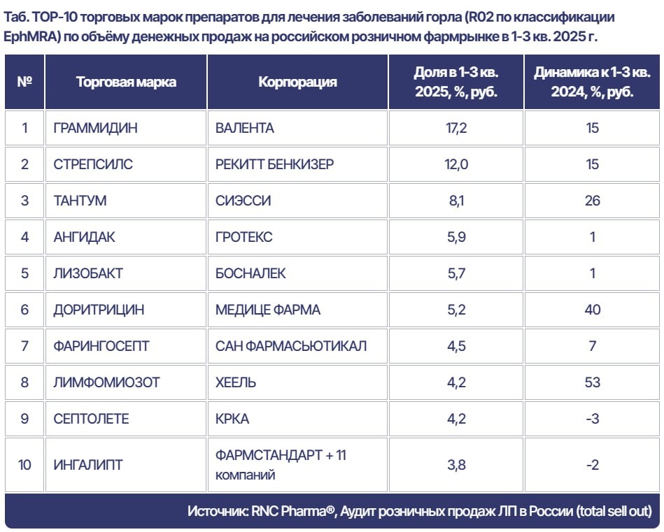 Траты россиян на препараты для горла выросли на 12% при падении в натуральном выражении на 2.1%. Увеличение денежного объема рынка связано со значительным ростом средней цены за упаковку, которая за год выросла на 14,5%, а за три года — почти на 36%. Более 60% продаж как в деньгах, так и в упаковках приходится на таблетки и пастилки для рассасывания.