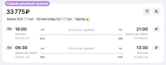 ✈️Москва - Шарм-эль-Шейх (Египет), прямые рейсы туда и обратно за 33800 рублей 25 ноября - 10 декабря - https://checkintime.ru/gdtv 🏖 Поиск туров | ✈️Авиабилеты